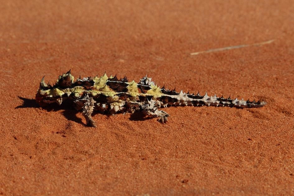 … et pourtant… Le premier, un Thorny devil (Moloch Horridus), se réchauffe sur la piste. Il ne fait à peine qu’une quinzaine de centimètres, mais il est impressionnant :