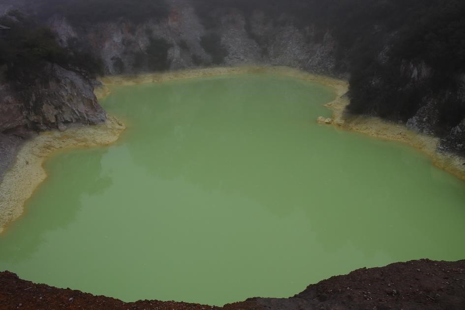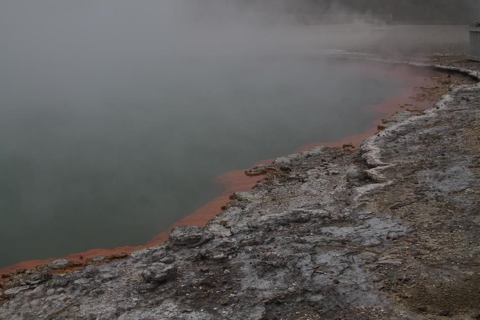 Changement complet de décor pour notre visite de l’après-midi. Nous sommes à Wai-O-Tapu, un site géothermique près de Rotorua. Les nombreuses sources de chaleur dans les alentours de Rotorua semble créer un micro-climat. Alors que le soleil joue avec les nuages jusqu’à Rotorua, les vallées géothermiques sont noyées dans le brouillard et c’est donc dans la grisaille que nous allons visiter ce site – le plus coloré de la région, dans une odeur de souffre plus ou moins prononcée :